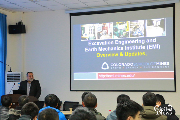 讲座主要分为两个部分。Jamal Rostami教授首先对美国科罗拉多矿业学院掘进工程与地球力学研究所进行了介绍。其中包括研究所的历史以及研究所内的各种先进的试验设备,同时Jamal Rostami教授还对各种试验设备的使用方法进行了详细的说明,使在场的同学收获颇丰。之后Jamal Rostami教授以前面所述为基础,主要讲解了“TBM刀具的设计研究”。在此过程中Jamal Rostami教授结合众多试验实例生动具体的为我们讲解TBM刀具设计的研究过程,并且为我们讲解了TBM在掘进过程的受力特点。