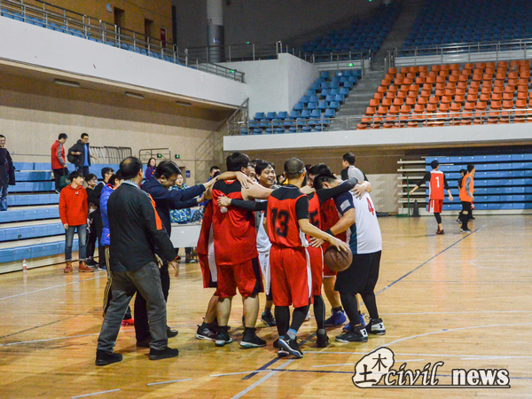 回到下半场,公政队率先发威,公政队10号先无视防守一记三分得手,又接球后手起刀落,再次命中三分将比分追至16:19。此时土木队9号站了出来,接连造成对方犯规,又晃起对手投篮命中,连得8分,稳住了局势。对手则接连不中,比分逐渐拉大。比赛结束时间将近,公政队采用犯规战术。由于比赛将尽和队员体力下降,土木罚球接连不中。但对手没有把握住机会,虽一度将比分追至五分之内,但土木依旧保持高强的防守。随着公政队三分不中,土木队拿到关键篮板,比赛结束,土木队最终以35:28战胜对手,勇夺2018年教职工篮球赛冠军。