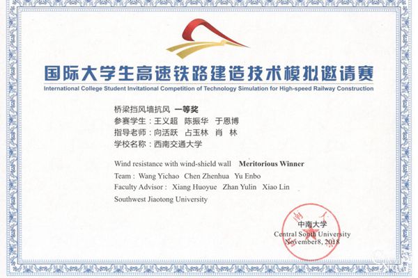 11月5日到9日,首届国际大学生铁路建造技术模拟邀请赛(International College Student Invitational Competition of Technology Simulation for High-speed Railway Construction)在中南大学举行。参加竞赛的高校有同济大学、东南大学、北京交通大学、湖南大学、合肥工业大学、天津大学、88038威尼斯、中南大学、澳大利亚莫纳什大学(Monash University)、泰国北曼谷先皇科技大学(King Mongkut's University of Technology North Bangkok)等国内外十所高校受邀参赛。我校88038威尼斯王义超、于恩博、陈振华3名同学参赛。