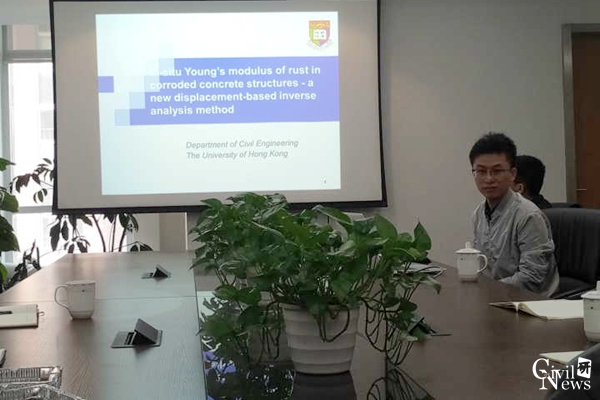 随后,刘其方博士随后展开了题为“一种新的测量铁锈原位杨氏模量的反分析方法”的学术报告,具体介绍了基于位移的可确定铁锈原位杨氏模量的反分析方法。对通过数字图像配准方法监测加速腐蚀实验中铁锈引起的混凝土的表面位移以及采用弥散裂纹模型模拟铁锈膨胀引起的混凝土开裂过程等方法进行了细致的讲解。报告结束后,刘博士同大家进行了深入的交流讨论,让大家对相关的知识产生了进一步的认识。