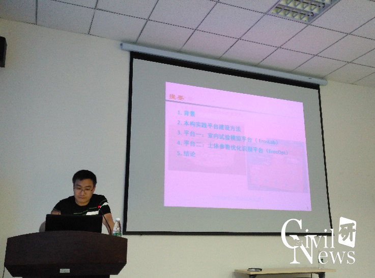 尹教授以“土的本构模拟及参数识别实践平台开发”为题向大家介绍了一个非常高效实用的土工计算软件平台。该软件平台包括Eroslab室内试验模拟平台和ErosOpt土体参数优化识别平台,由尹教授及其学生金银富博士自主开发设计。它的主要界面由微软的Visual C完成,后台计算程序使用FORTRAN语言编译,主要负责计算任务和模拟分析;后处理界面则由MATLAB完成,负责处理计算结果、绘制计算曲线结果图。整个平台包含丰富的本构模型、多样的加载控制模式和完备的本构模型调试功能,尹教授也现场演示了部分实际操作步骤,十分强大高效。