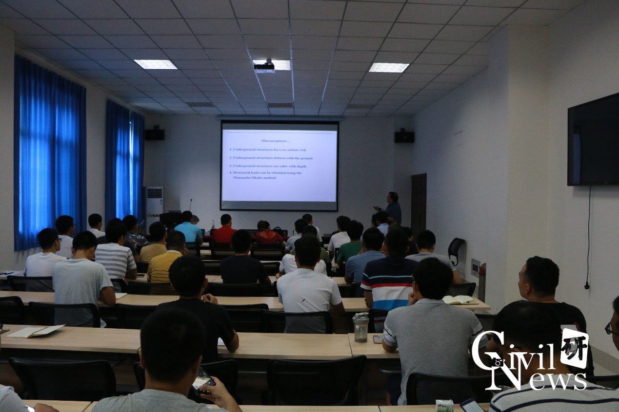 Bobet教授首先结合典型隧道及车站震害情况,提出地下结构抗震研究的重要性,然后介绍了地震引起地下结构破坏的因素,重点分析了目前基于自由场的地下结构抗震设计的理论分析方法,提出由于自由场法没有考虑土与结构的相互作用,其结果与实际可能存在偏差的观点。接着,Bobet教授表示任何地震分析都必须包括土与结构的相互作用,对此提出了拟静力法、模量软化法等几个简单的解决方案估计地震引起地下结构的变形,对比分析了在排水与不排水的情况下,圆形和矩形截面的地下结构在地震作用下的动力响应,并对其差异进行了讨论。最后,Bobet教授总结了在地下结构抗震分析中的4个常见的错误观点,并对每一个误解进行了解答,并例举了相应的案例和理论依据。在此基础上,他对现行的隧道抗震设计方法进行了深入浅出的分析,并追根溯源探讨了其中的原理,也提出了存在的不足,并就其应用与大家做了分享。