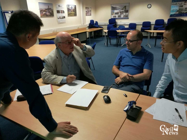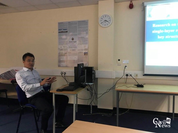 在此期间,S. Alireza Behnejad博士就单层网壳结构选型理论和Formian软件快速建模方法进行汇报交流;张明老师对本项目组就“Research on the seismic failure load of single-layer reticulated shells based on key structural design parameters”中单层网壳结构失效机理及评判标准等问题研究进展做了汇报,分析并讨论了该方法的有效性和可操作性;正在该校访学的项目组成员刘占辉老师做了“Analysis of Frequency Loci Veering Phenomena in Detuned Spherical Reticulated Shell”的研究进展汇报,分析了大跨单层网壳由于对称结构失谐造成的频率转向现象的机理;谢明志老师做了“Construction Control for Thousand-meter-scale Cable-stayed Bridge and the Seismic Fragility Analysis of Long-Span Cable-Stayed Bridge of High Speed Railway”的报告,探讨了大跨高铁矮塔斜拉桥地震功能损伤及冲击破坏等问题。Gerry Parke教授就上述研究报告进行深入点评,结合多年科研经历阐述本项目重、难点问题,并指出下一阶段研究过程中应注意的细节问题。双方经多次沟通交流,进一步细化了本项目研究路线及实施方案,为推动和加强双方下一次交流讨论及深化合作奠定了坚实基础。