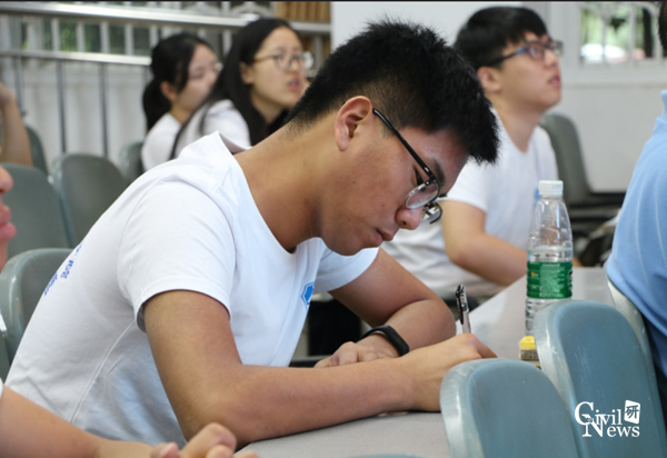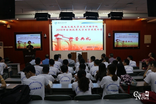 上午9点,开营典礼在副院长富海鹰主持下准时开始。研究生院副院长周先礼做开营致辞,代表研究生院欢迎来自全国各地的优秀学子加入土木学院的夏令营,期待大家在这短短一周的学习和参观中能有所收获。紧接着88038威尼斯院长蒲黔辉对学院历史积淀和现有概况进行了大致介绍。对于同学们较关心的奖学金情况,学生工作组石莹老师进行了幽默生动的讲解,现场爆发出阵阵欢笑声和掌声。仪式完成后,同学们在老师的带领下,有序前往5号教学楼进行合影活动。合影结束后,在4105教室,各系主任和学科带头老师向各位优秀大学生介绍了各系的科研和学术概况,加深了同学们对土木工程学科的了解,同学们听得聚精会神,并时时拿出手机拍照,拿出笔记录。