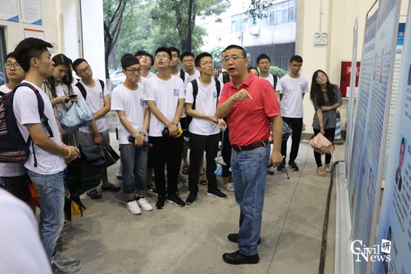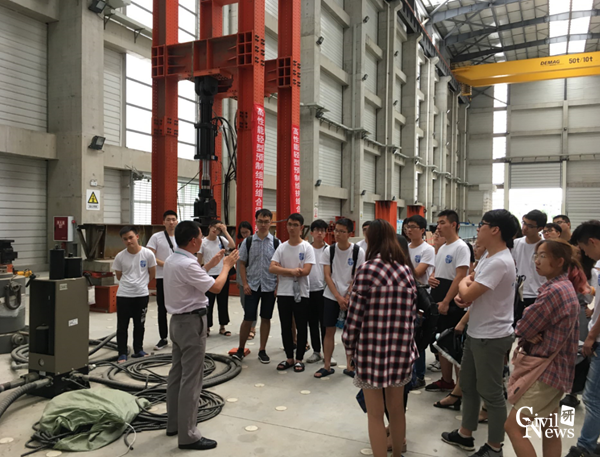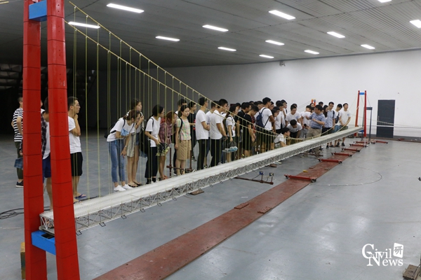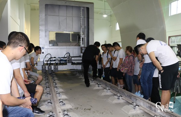 下午14点,全体营员乘坐校车前往犀浦校区参观。首先,大家来到雄伟壮观的犀浦校区图书馆。邓开来博士向大家详细的介绍了学校丰富的文献库和数据库,并简单讲解了数据库的基本使用流程,让大家对学校的图情系统有了初步的了解。随后,大家前往了陆地交通地质灾害防治技术国家工程实验室参观了亚洲最大的地震台系统,实验室邵长江教授热情的接待了同学们,并风趣幽默地向大家介绍了一组组大型模型试验,这让刚完成三年本科学习的营员们对结构抗震试验有了初步认识。最后,营员们来到世界第一大的边界层风洞实验室进行参观,正赶上桥梁系的研究生正在进行试验。营员们在王骑老师的带领下有序参观,积极提问。面对如此精美的桥梁模型,同学们纷纷拿出手机拍照记录。