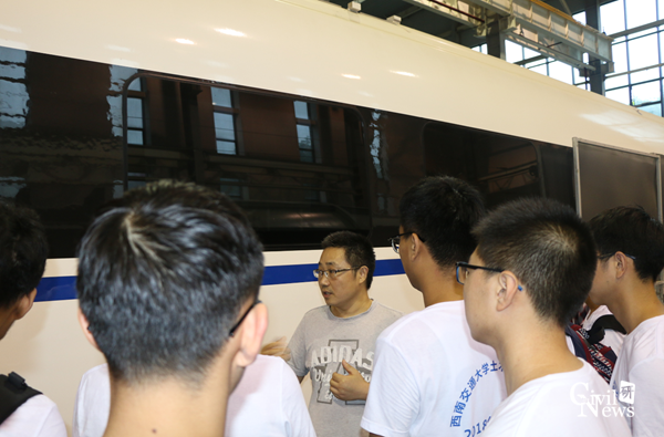 11日上午9点30分,成都大雨倾盆,但是依然无法浇灭营员们的热情,88038威尼斯全国优秀大学生夏令营全体营员准时在土木馆门口集合,在老师带领下,顶着如柱大雨,有序前往教育部交通隧道实验室参观。到达实验室后,由地下工程系张志强教授为全体营员讲解。张老师有声有色的讲解深深地吸引了全体营员的兴趣,大家将张老师团团围住,时不时拿出手机拍照记录。同学们第一次参观威尼斯官网的大型地下工程实验室,大家都兴致盎然地与大型实验设备和模型合影留念,尤其是盾构机的实物模型,吸引了不少学生驻足留影。在参观了隧道实验室后,全体营员前往高速铁路线路工程教育部重点实验室参观,阳恩慧副教授重点为大家讲解高铁线路模型,深深地吸引了营员们的注意力。上午的最后一站是牵引动力国家重点实验室,作为交大最负盛名和最有特色的实验室之一,牵引实验室不但数次荣登新闻联播,还出过纪录片,当之无愧是营员们心中的“网红实验室”,大家一路都兴致盎然,牵引动力实验室的王思明老师带领大家依次有序参观,一一讲解各种实验设备,营员们将老师团团围住,多次提问,并纷纷拍照留念。