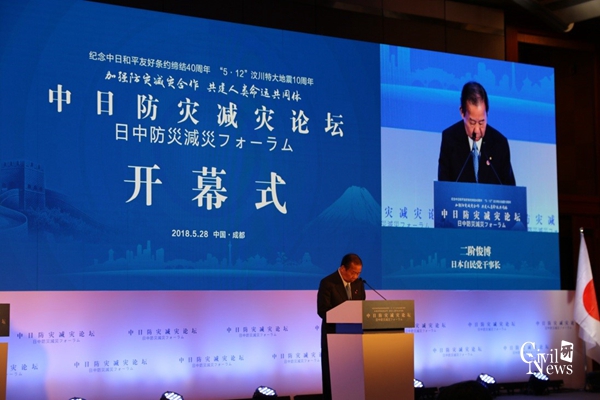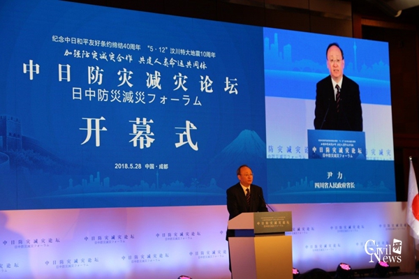 论坛开幕式由四川省人民政府副省长朱鹤新主持,四川省人民政府省长尹力、日本自民党干事长二阶俊博、中国人民对外友好协会副会长宋敬武、日本经济团体联合会副主席山内隆司分别致辞。中日双方领导感谢了对方在灾难面前所做的援助,肯定了双方在防灾减灾所做出的努力,并对未来双方的交流合作进行了展望,并希望能以此论坛为契机,促进双方在更多领域进行交流与合作,推动日中关系发展。成都市市长罗强出席了会议。
