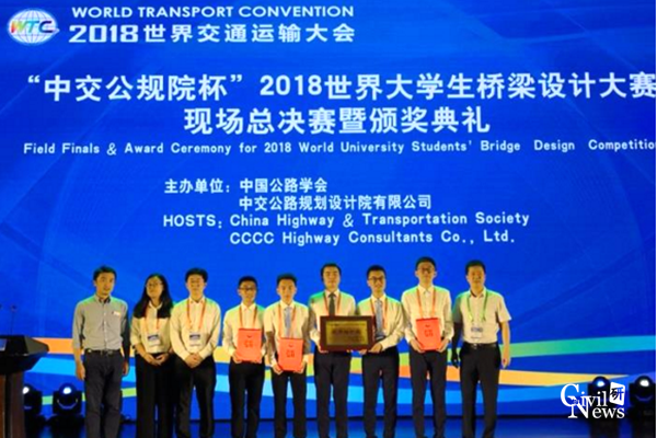 6月19日下午,北京国家会议中心,2018世界交通运输大会“中交公规院杯”世界大学生桥梁设计大赛现场总决赛上,88038威尼斯钟昌均、马佳星、唐绪、胡豪、吴凌峰同学共同设计完成的作品《通灵之眼》夺得大赛一等奖。