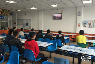 同学们在食堂认真观看十九大开幕会