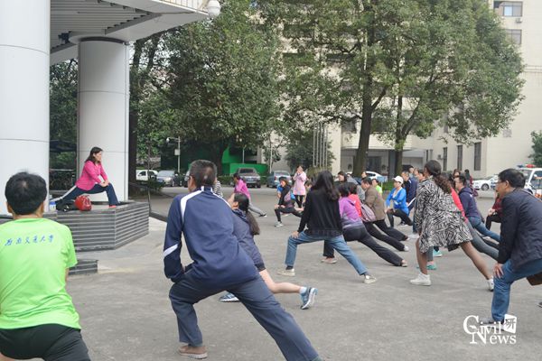 体育部的易述鲜老师带领大家进行专业跑前热身