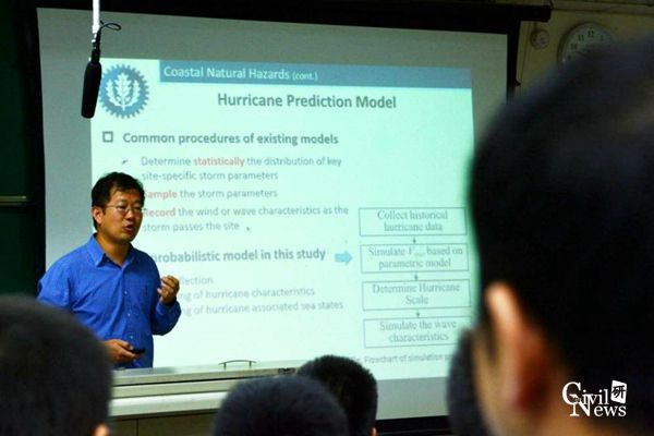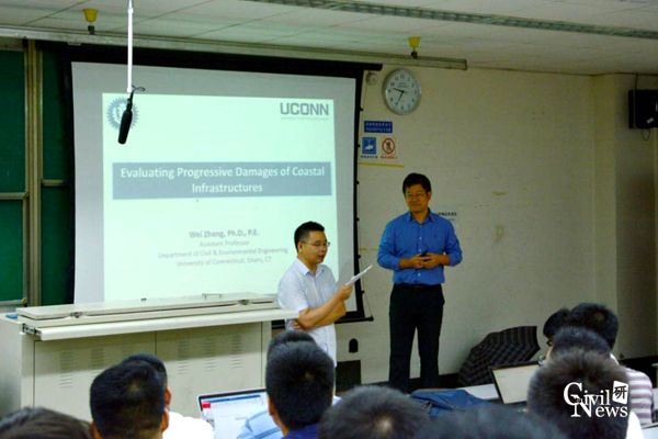 应桥梁工程系李永乐教授、汪斌副教授邀请,美国康涅狄格大学张伟博士于8月21日—8月23日访问我校。8月21日上午,张伟博士在九里校区逸夫馆4209教室带来了一场题为“Evaluating Progressive Damages of Coastal Infrastructures”的精彩学术报告会。我校桥梁工程系主任李永乐教授、副主任张清华教授、郑史雄教授、晋智斌副教授、魏凯副教授、姚昌荣老师、王骑老师、张明金老师及三十余名博士、硕士研究生聆听了报告,参与交流。