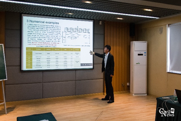 接着,张金博士生汇报了在澳大利亚科廷大学联合培养期间的学术研究进展。在澳学习期间,张金博士生师从澳洲工程院院士、澳洲地震学会前主席Hong Hao教授,研究桥梁结构在地震灾害下的系统可靠性。在归纳推导新颖的随机过程降维法理论的基础上,结合最大熵原理,考虑桥梁结构本身以及地震动的随机性,分别以某一山区高墩大跨刚构桥以及大跨度铁路斜拉桥为工程实例,分析了桥梁系统在强震下的动力可靠性。汇报结束后,郑史雄教授和贾宏宇博士分别结合自己的实际研究,针对部分细节问题,提出了宝贵的建议。