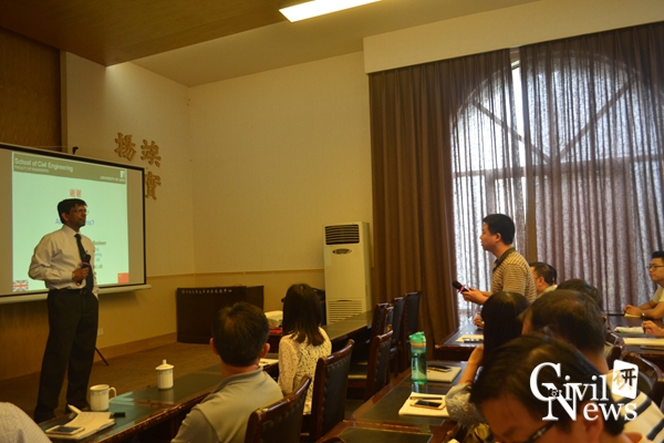 Basheer 教授首先介绍了英国利兹大学及88038威尼斯的基本情况,包括本科生和研究生的课程设计、培养目标等。然后,对钢筋混凝土结构无损检测技术做了报告,重点介绍了3种传感器(电阻式传感器(electrical resistance sensor)、腐蚀传感器(corrosion sensor)和光纤传感器(fiber sensor))在混凝土结构无损检测中的研究和应用情况。基于这三种无损检测技术,混凝土结构的性能可以被实时监测,并可建立服役寿命预测模型,用于预测其服役时间,便于工程师采用加固或者维护措施。同时,Basheer 教授还介绍了土木工程中的NDT检测方法,该方法帮助我们理解外界的腐蚀性物质以多快的速度侵蚀混凝土结构,从而影响结构的耐久性和服役寿命。最后,他通过对比不同服役寿命的预测模型,指出了将来研究工作的重点和方向。
