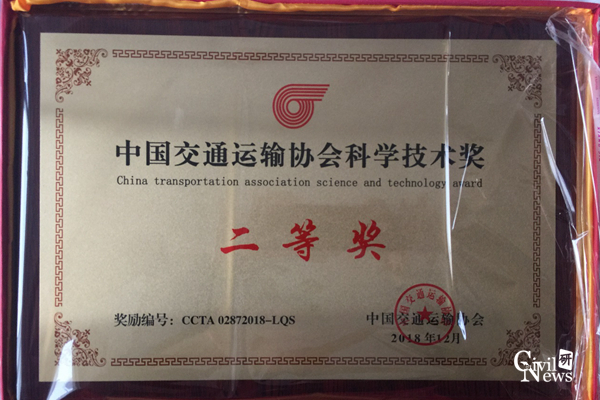 2018年1月5日,中国交通运输协会科学技术奖(奖励编号0287)在北京泰山饭店举行颁奖仪式,该奖项经国家科学技术奖励工作办公室批准设立,今年参加评审的项目超过400项,经过初评、复评、答辩和公示等环节,最终获批171项科学技术奖,其中一等奖24项,二等奖56项,三等奖91项。