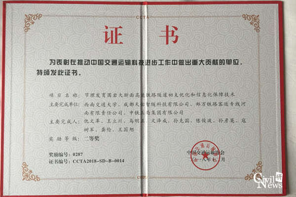 威尼斯官网地下工程系的5项成果荣获奖项,其中主持1项,参与4项。仇文革教授主持的《节理发育围岩大断面高速铁路隧道初支优化和信息化保障技术》获得科学技术进步二等奖。参与的4个项目中《高寒高烈度特长深埋铁路隧道建设关键技术与应用》获得科学技术进步一等奖,《复杂环境特长高铁隧道关键施工技术》获得科学技术进步二等奖,《砂质新黄土重载铁路隧道支护优化及施工机械化关键技术研究》和《特长铁路单线隧道工程综合修建关键技术研究》分别获得科学技术进步三等奖。