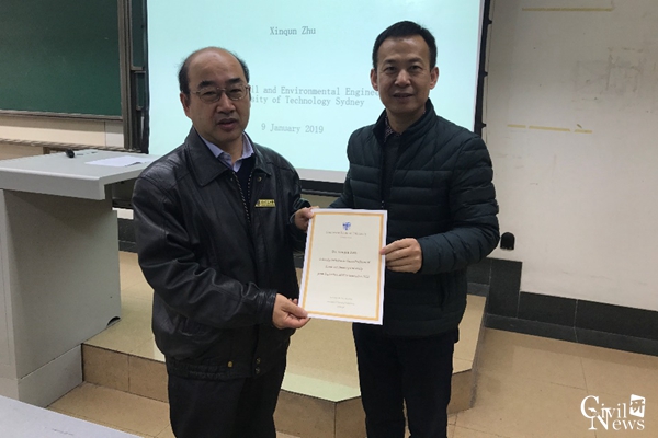 2019年1月9日下午,在九里校区四号教学楼4318教室举行了朱信群博士的客座教授聘任仪式,由土木学院院长蒲黔辉教授主持并为朱教授佩戴校徽和颁发聘书,桥梁系李永乐、肖林、姚昌荣、张迅、张明金等教师和相关专业方向的研究生参加了聘任仪式。