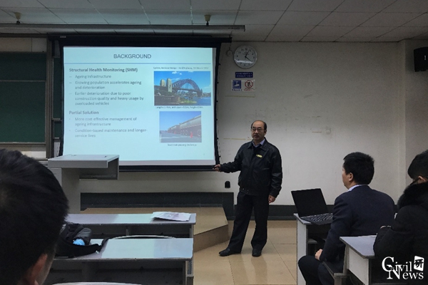 随后由朱信群教授带来了一场题为“Drive-by bridge parameter identification”的精彩学术报告。由于基础设施的老化,加上超载车辆的增多,使得桥梁积累损伤,故桥梁损伤后的模态参数识别尤为重要。朱教授及其团队提出了一种移动车辆的参数识别方法,通过物联网车载试验平台对桥梁的时变损伤性能进行评估。通过盲源分离的模态参数提取方法,并通过数值模拟和试验验证。