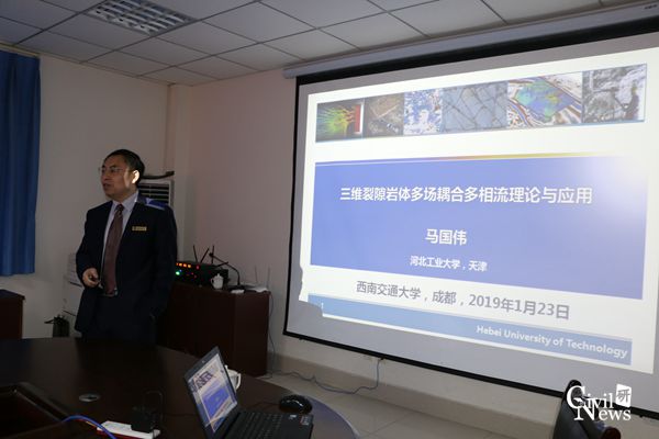受聘仪式结束后,马国伟教授开展了题为 “三维裂隙岩体多场耦合多相流理论与应用”的学术报告。马国伟教授首先介绍了自己的求学经历,之后马教授从数值分析切入,详细讲解了他自主研发的裂隙建模软件,利用了管道网络计算方法,将三维、二维问题简化成为一维模型,大大降低了运算成本和运算时间。马教授还表示采用3D打印技术制作裂隙岩体模型能够进一步对既有裂隙岩体进行有效的试验分析。