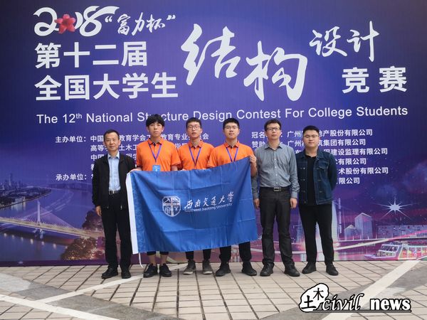 2018年11月11日,“富力杯”第十二届全国大学生结构设计竞赛在华南理工大学落下帷幕。经过四天紧张的现场制作、现场答辩及加载测试,由我校土木学院建筑工程系郭瑞、周祎任指导教师,余志祥任指导小组组长,李力任指导顾问,叶高宏、郑浩宇、周豪三名同学组成的西南交大代表队获得了本届全国大学生结构设计竞赛一等奖,此外,我校还获得各省、市自治区秘书处优秀组织奖。这是继我校在第三届(2009年)、第五届(2011年)取得了特等奖(第一名)后,第五次获得全国一等奖(2013年第七届、2014年第八届、2015年第九届、2016年第十届),至此我校共获得了两次特等奖、五次一等奖,六次优秀组织奖,在全国高校中遥遥领先。