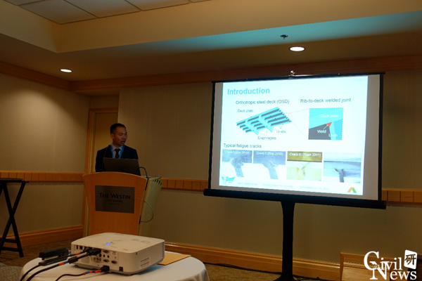 我校与会代表共做了4场学术报告:博士生周筱航做了题为《Modal parameter identification of a curved cable-stayed model bridge based on EDA and DATA-SSI》的报告;博士生张二华做了题为《Influence of curvature radius on static and dynamic characteristics of curved cable-stayed bridge》的报告;博士生程震宇做了题为《Optimal design and fatigue performances of innovative corrugated orthotropic steel deck plate-RPC layer composite deck structure》的报告;博士生罗鹏军做了题为《Fatigue evaluation and parametric study on orthotropic steel deck composed of a new-type of U-rib with upset webs》的报告。报告介绍了桥梁工程系在健康监测和高性能结构桥梁方面的最新研究进行,引起了国内外同行的浓厚兴趣,取得的成果获得了国内外同行的好评。