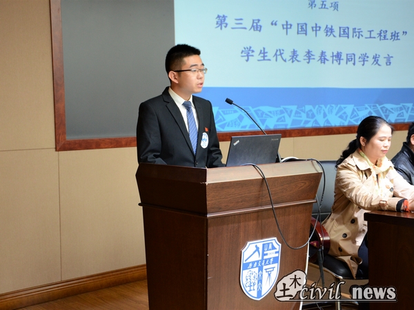 作为中国中铁国际工程班的第一届毕业生代表,中铁八局的杨远胜校友分享了他一年多的海外学习工作经验,讲述他如何成为一个能沟通、懂技术、会管理的合格海外工程人。随后学生代表李春博发言,并对表示了加入国际工程班极大的憧憬,“很感谢学校和中国中铁带给我们的资源,通过建设各类国际工程项目,我们一定能开创新时代。”