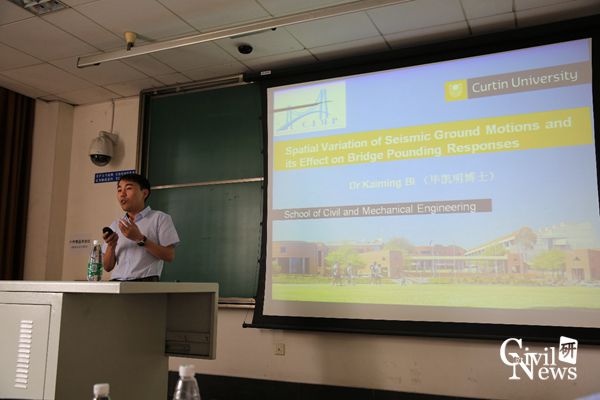2017年5月31日,澳大利亚科廷大学(Curtin University)毕凯明博士应邀到访我校,并在九里校区逸夫馆4421教室带来了一场题为“地震动的空间变异性及其对桥梁结构碰撞响应的影响”的学术报告。我校桥梁系郑史雄教授、张清华教授、叶华文副教授、徐腾飞副教授、魏凯副教授、张迅副教授、刘德军博士、梁艳博士等多位老师,以及数十位博士、硕士研究生聆听了报告。此外,该报告还吸引了建工系、防灾所、峨眉校区土木系等相关系所的多位师生。