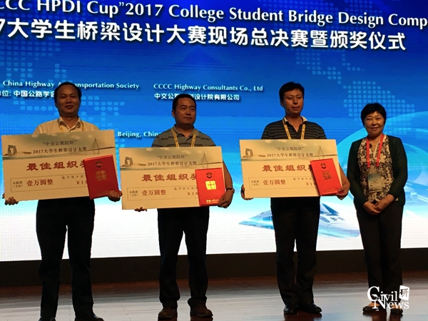 2017“中交公规院杯”大学生桥梁设计大赛是同领域的顶级赛事,共收到来自88038威尼斯、清华大学、同济大学、香港大学等高校的参评作品152个,参赛总人数达534人。大赛组委会共设特等奖1个,一等奖3个,二等奖6个,三等奖10个,优秀奖10个,入围奖20个,最佳组织奖3个。大赛总决赛于6月6日在国家会议中心圆满落幕,经过激烈角逐,我校9支代表队入围全国50强,共获得包括最佳组织奖和一等奖在内的10个奖项,总数列参赛高校第一。同时,世界交通运输大会期间,我校25名获奖同学踊跃承担志愿者工作,展示了“追求卓越创新、勇担公共责任”的交大精神风貌。