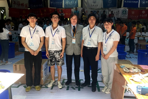 大赛组委会为参赛队员提供75cm*50cm*50cm的模型砂箱,队员通过白卡纸和牛皮纸在规定时间内完成加筋土挡墙模型制作。比赛过程中,美国CPESC和意大利注册专业工程师、马克菲尔集团土工合成材料首席专家和亚太地区技术总监Pietro Rimoldi对于我校参赛队的方案设计和施工工艺给予高度评价,并与苏谦教授和参赛队员合影留念。