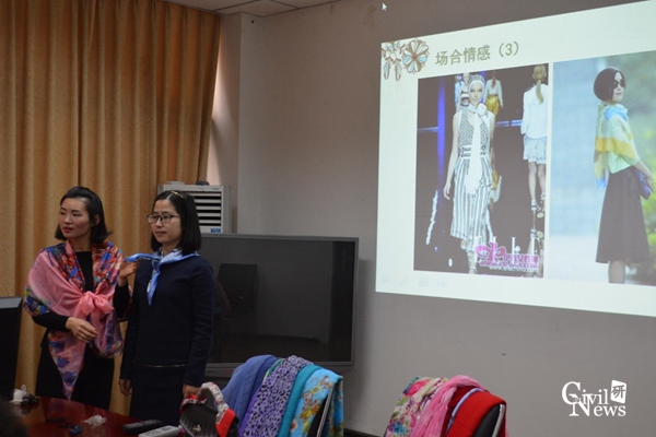 作为此次活动的主讲嘉宾,COCO老师从丝巾的发展、丝巾搭配原则、认识丝巾、图案情感、色彩选择策略和丝巾的妙用及系法六个方面向各位女教师介绍了丝巾在女性同胞生活中的妙用。其中,COCO老师给各位女教师在丝巾选择方面支出了妙招——根据自己的喜好,为个人做出最佳选择。在展示丝巾的系法时,COCO老师更是手把手教学,向各位女教师介绍了平结、正反折纸节和蝴蝶结三种系法。