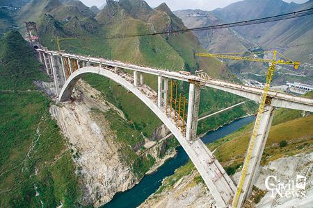 北盘江特大桥于2010年10月开工建设,预算投资4.46亿元;2014年1月12日劲性骨架结构合龙;2015年11月19日实现全桥合龙,2016年9月通过验收,预计2016年底通车运营。