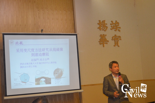 紧接着赵振副教授为大家做演讲,演讲内容为“从线性碰撞到滚动摩阻的变尺度研究方法”,赵振副教授讲到由于滚动摩阻一般很小,直接开展实验研究时干扰因素多,误差较大,故他从棱柱的线碰撞问题入手,采用一种变尺度的研究方法,理论和实验结合,最终获得滚动摩阻与压力和滚速的函数关系。